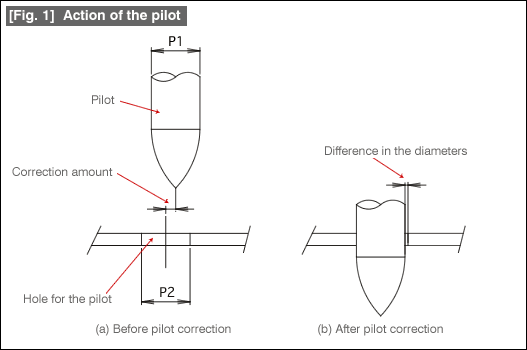 Pilots are used for the purpose of correcting to the proper state the material position before carrying out the press operation (see also, Pilot (1) of No. 95). In general, as is shown in Fig. 1, the pilot is pushed inside the hole thereby correct the shift. At that time, the amount of shift between the center of the pilot and the center of the hole is called the correction amount. The correction amount is proportional to the material thickness and the pilot diameter. The minimum actual dimension of the pilot diameter is about 1mm diameter.