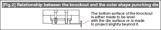 A knockout has two roles, that is, the role of a stripper of a hole punching punch and the role of ejecting the product that has entered inside the die. Normally, a knockout is prepared with the same shape as that of the product. As shown in Fig. 2, the surface of the knockout is either made level with the die surface or is made to project slightly beyond it. The amount of projection is about 0.5 mm to 1.0 mm. Contrary to common assumption, it is very rare that its surface is made level with the surface of the die.