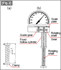 Prepare a rectangular test piece (mild steel, 20 mm wide, and 0.2 to 0.5 mm thick) and wind it diagonally around the 20 mmΦ iron core, spaced approximately 0.5 mm apart. This will make a spiral (tabular spring) test piece (a). After insulating the internal surface, secure the top of the test piece onto the fixed axis of the top of the contract meter (b), while securing the bottom of the test piece onto the rotating shaft at the lower end. Apply plating over this test piece in the same conditions as those for the actual product.Using the gear mechanism, the dial gauge displays the angle of the twisted spiral that was caused by the electrodeposition stress. [Fig.2] shows a structure of the device. |